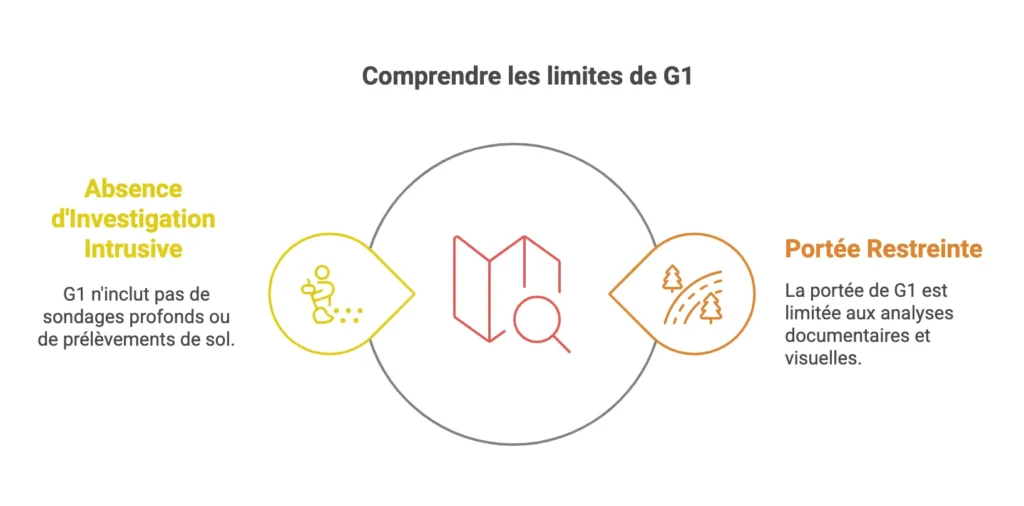 - Absence d’Investigation Intrusive : La G1 repose principalement sur des analyses documentaires et visuelles, sans sondages profonds ou prélèvements de sol.